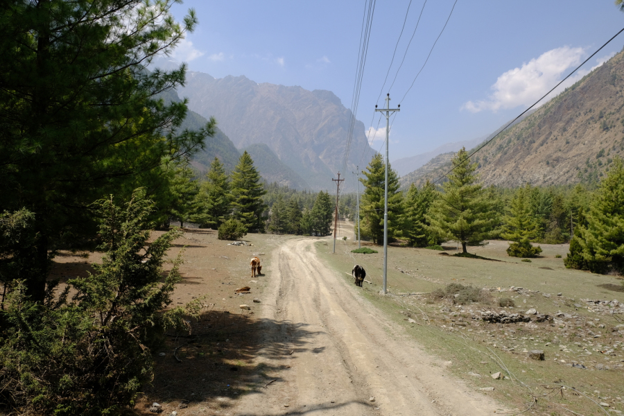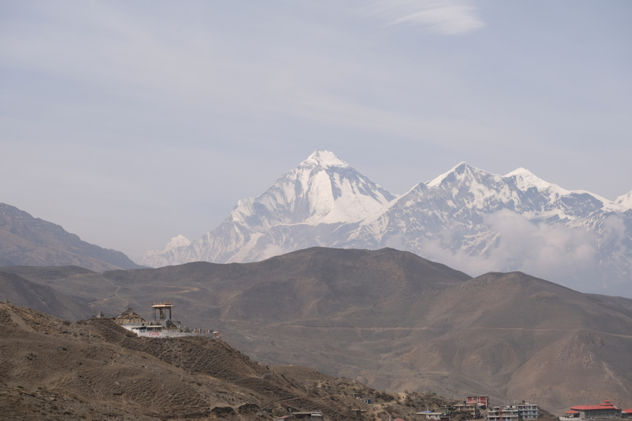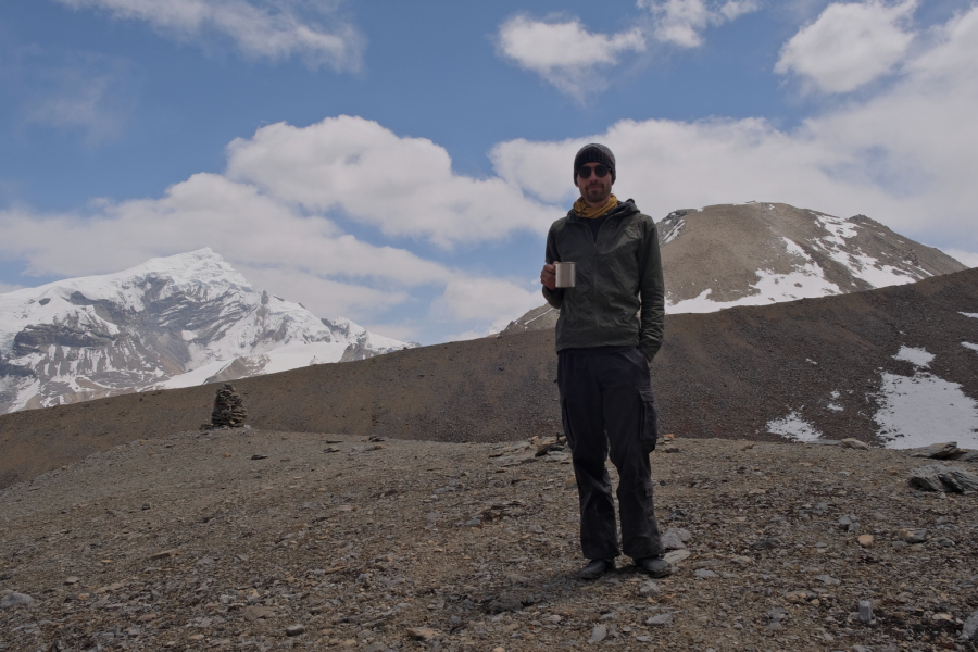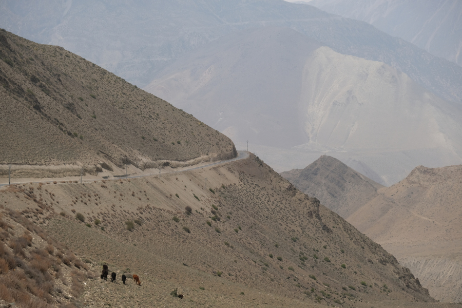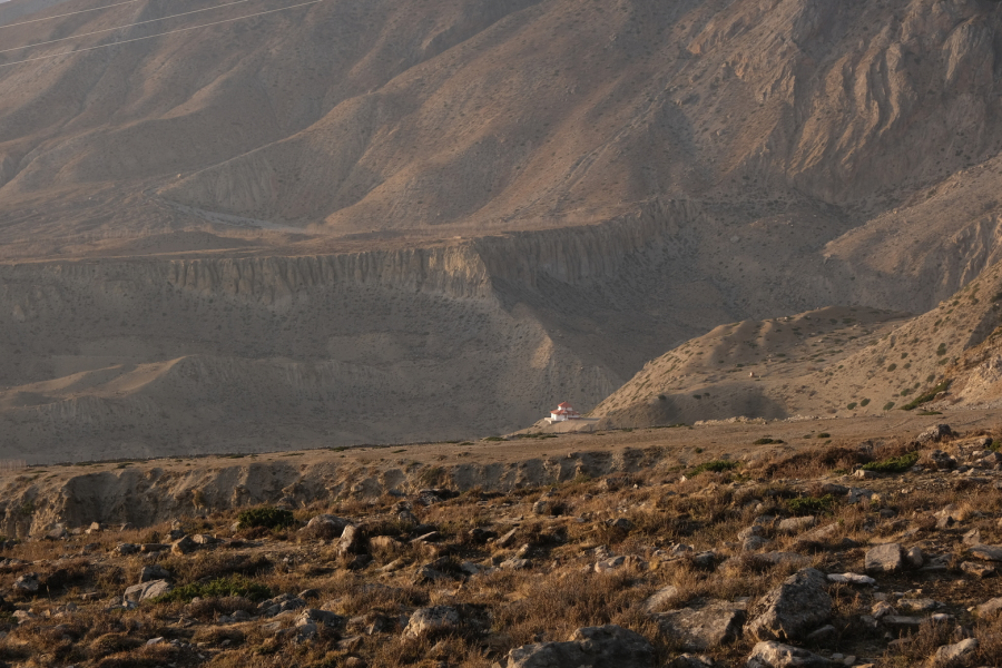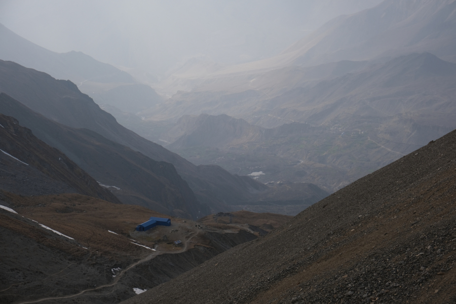 Zum Pass geht es einigermaßen stetig bergauf. Die Teehausdichte nimmt ab, Ortschaften werden noch kleiner und spärlicher. Ich gehe im bewährten Minimaltempo und komme gut gelaunt oben an. Dort trinke ich Tee mit viel Zucker. Im Teehäuschen läuft leicht rauschendes Radio mit nepalesischer Musik. Der Verkäufer Sanna ist so alt wie ich und 3 Monate am Stück hier. Danach wird er abgelöst und kann nach Hause zu Frau und zwei Kindern. Die Saison war Corona-bedingt noch schlecht, aber es geht jetzt metaphorisch bergauf. Vom Pass aus geht es physisch recht schnell bergab. Ich ziehe den Tag in die Länge und wandere bis zum Sonnenuntergang nach Muktinath.