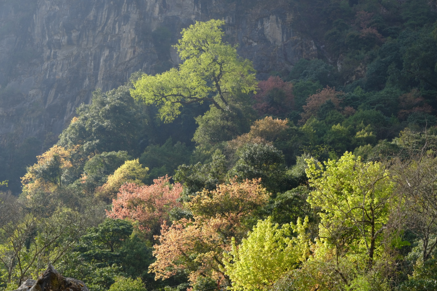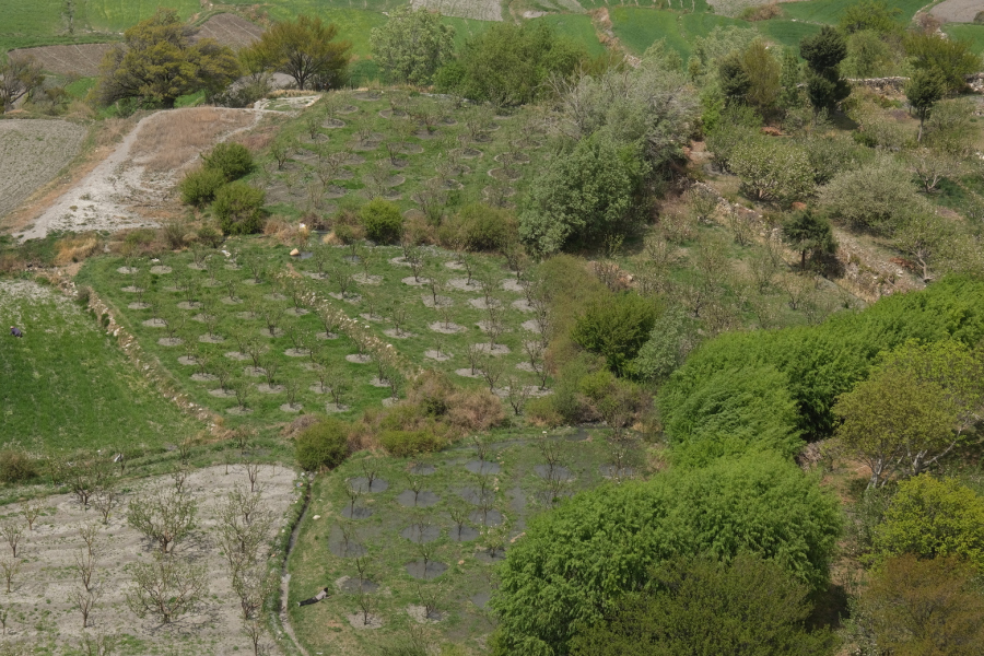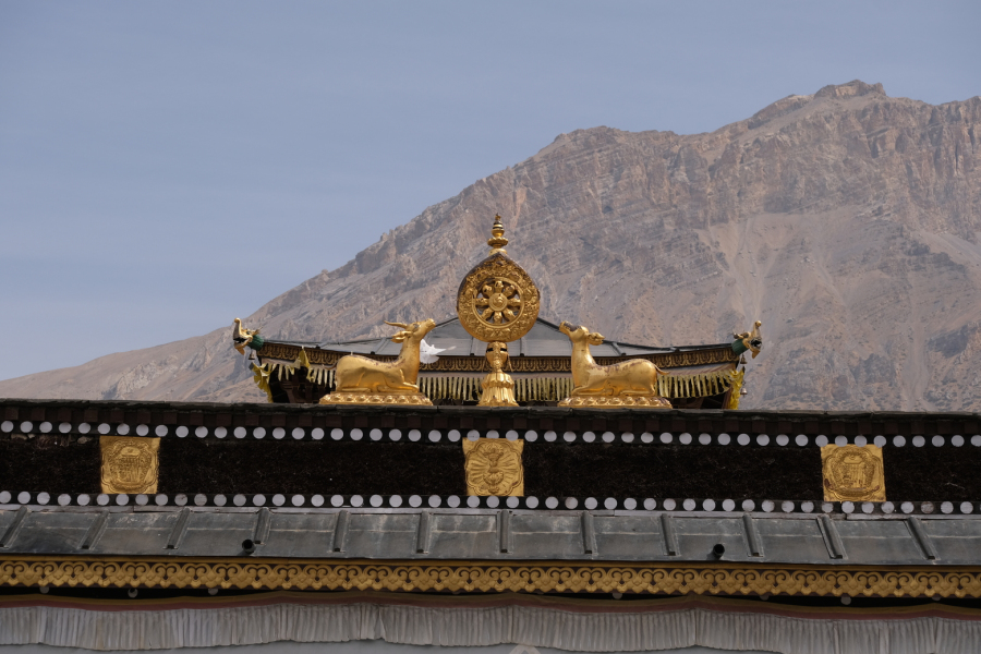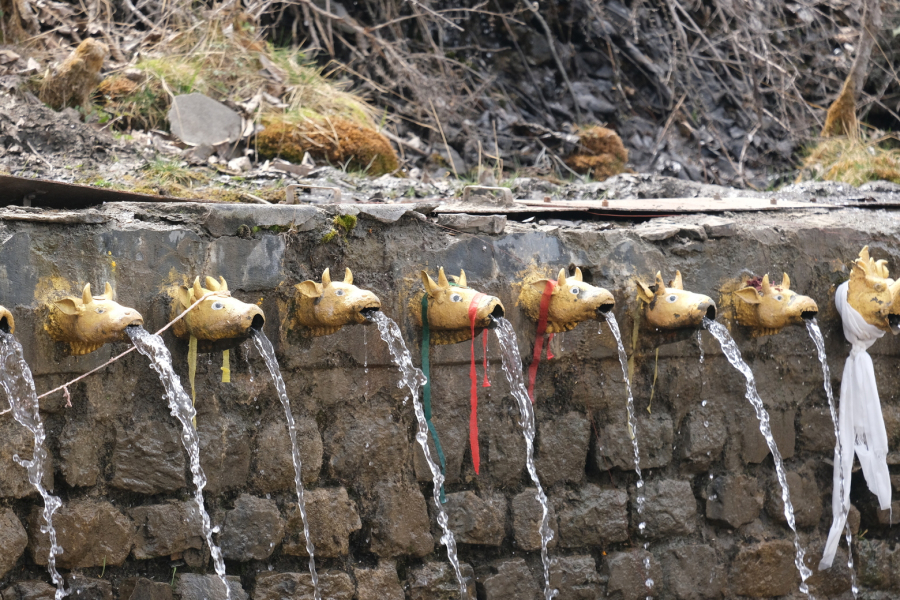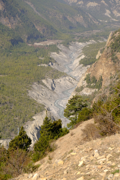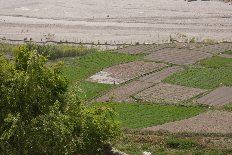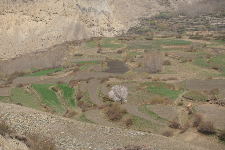 Muktinath ist dank einer erdgespeisten Gasflamme direkt nebst natürlicher Wasserquelle Pilgerstätte für Buddhisten und Hindus. Die Flamme kann man nicht fotografieren und auch kaum sehen, aber die Quelle kommt aus sehr vielen vergoldeten Kuhköpfen. Im weiteren Abstieg mischt sich in die Wüstenlandschaft vermehrt bewässertes Grün in Terrassen.