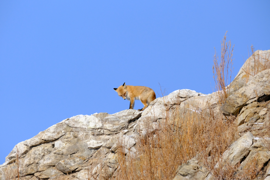Wir fahren weiter über das Eis und machen gelegentlich Halt an großen und kleinen Felsen. In deren Nähe wird der glatte Boden von gestapelten Eisschollen abgelöst. An den meisten Stellen liegt Schnee. Gegen April ist der gesamte See wohl glatt gefroren, weil es oben immer wieder antaut. Man kann dann einmal um die Insel Schlittschuh fahren.