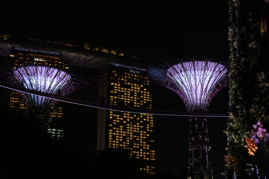 Ein paar dieser Aktivitäten nehme ich mit. Kostenlos sind etwa die künstlichen Riesenbäume in der Marina Bay. Jeden Abend gibt es eine 45 minütige Lichterschau, welche, fokussiert auf die musikalischen Höhepunkte, familienfreundliche Popmusik optisch untermalt. Lautsprecherdurchsagen ermutigen dazu, Kameras auszupacken und Bilder zu teilen. Dem leiste ich hiermit Folge: