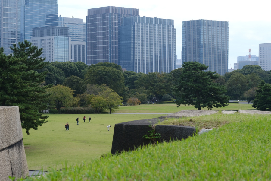 Mit meiner Körperlänge bin ich hier zwar ein wandelnder Leuchtturm, aber zumindest was den Fortbewegungsmodus angeht, mische ich mich unter die Menschen und erkunde wie gewohnt alles zu Fuß. An meinem ersten ganzen Tag lande ich beim Wandern im Garten des Kaisers, jedenfalls im öffentlichen Teil davon, denn der Palast wird tatsächlich noch bewohnt. Die gesamte Anlage ist von Wassergräben umgeben. Im Garten wird eine höchst gepflegte Rasenfläche durch kurvige Hauptwege aufgetrennt, sowie mit verschiedenen Bäumen und Hecken verziert. Seitenwege führen durch hügelige bambus-kiefer-mischwald-artige Abschnitte, die zusammen mit grauem Mauerwerk alles einrahmen. Natürlich gibt es eine Teichanlange mit Kois. Auffällig ist für mich ein Abschnitt mit alten Obstbaumsorten, die der Kaiser nach Eigenangaben zu Bildungszwecken für das Volk hat pflanzen lassen. Die Bäume hängen voll mit reifem Obst. Es gibt weder Zaun noch Hinweisschilder und Menschen laufen zwischen den Pflanzen hindurch ohne sich zu bedienen.